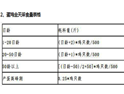 肉鸡采食量计算公式 参考《一》1000只肉鸡某一天的全天采食量公式为:(表一) 肉鸡:从**天开始每天增加5克。即1000只白羽肉鸡第35日龄采食量为:例如:1000只肉鸡第15天的全天采食量为:①15......[详情]
