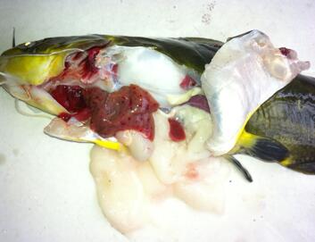 对病死鱼解剖,可见肠内、肌肉和胃部充血,腹腔有很多积水,胃里面没有食物或有非常少的食物,内脏异常。